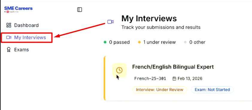 After completing the interview you can access your interview results in the My Interviews tab in the sidebar on sme.careeers/dashboard