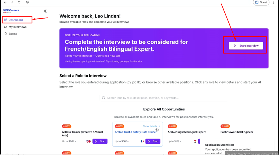 If you entered a job id in the application form you will be prompted to complete the interview by a banner in the top of your dashboard. Click Start Interview and you will be redirected to our interview poral