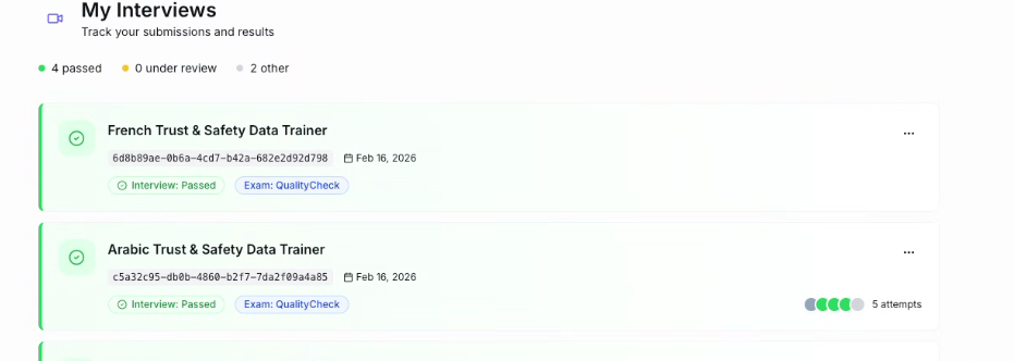 Passing an interview is not a guarantee to be matched with a project. For example, a project might have specific country and educational requirements, or already be fully staffed by the time your interview is completed. In this case you will be added to our network and we will reach out once a suitable project becomes available