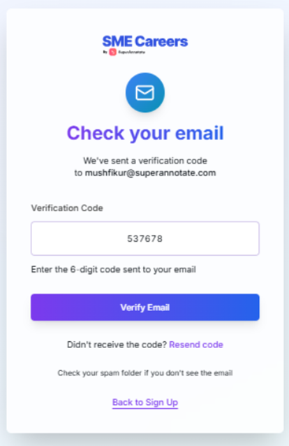 - Enter the code and click Verify Email